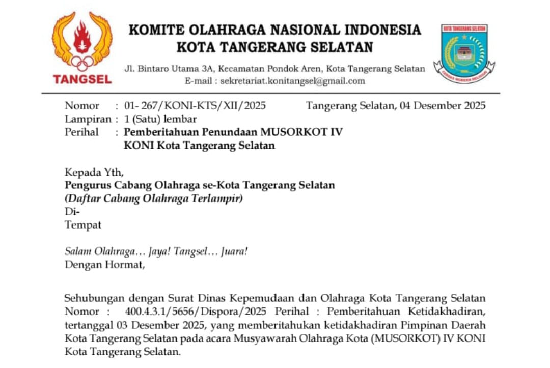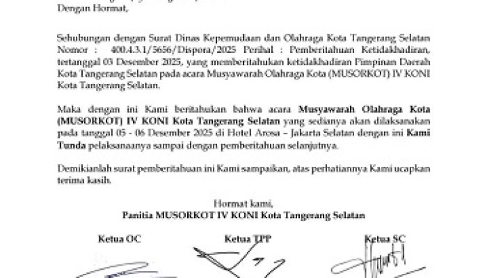 detak.co.id, PONDOK AREN – Agenda Musyawarah Olahraga Kota IV (Musorkot ke-4) Komite Olahraga Nasional Indonesia (KONI) Kota Tangerang Selatan yang sudah dijadwalkan akan digelar pada Jum’at-Sabtu (05-06/12/2025), tiba-tiba dibatalkan dan diundur pelaksanaannya tanpa batas waktu. Hal tersebut tertuang dalam surat KONI Tangerang Selatan Nomor: 01-267/KONI-KTS/XII/2025 tentang Penundaan Pelaksanaan Musorkot IV KONI Kota Tangerang Selatan yang ditandatangani Ketua OC Haryadi, Ketua TPP Landung Mintohardjo, Ketua SC Henry Kristianto, dan diketahui oleh Ketua KONI Hamka Handaru.