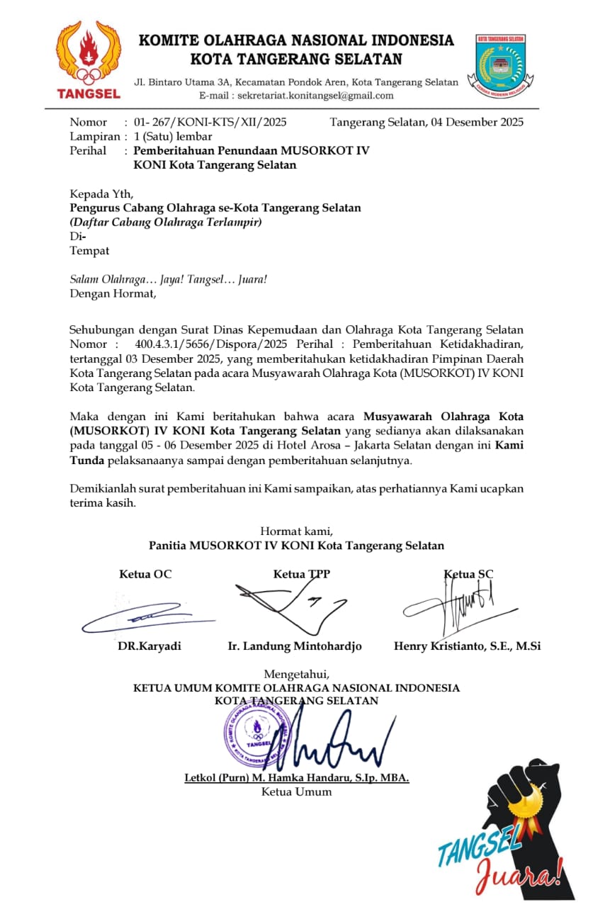 detaktangsel.com, PONDOK AREN – Agenda Musyawarah Olahraga Kota IV (Musorkot ke-4) Komite Olahraga Nasional Indonesia (KONI) Kota Tangerang Selatan yang sudah dijadwalkan akan digelar pada Jum’at-Sabtu (05-06/12/2025), tiba-tiba dibatalkan dan diundur pelaksanaannya tanpa batas waktu. Hal tersebut tertuang dalam surat KONI Tangerang Selatan Nomor: 01-267/KONI-KTS/XII/2025 tentang Penundaan Pelaksanaan Musorkot IV KONI Kota Tangerang Selatan yang ditandatangani Ketua OC Haryadi, Ketua TPP Landung Mintohardjo, Ketua SC Henry Kristianto, dan diketahui oleh Ketua KONI Hamka Handaru.
