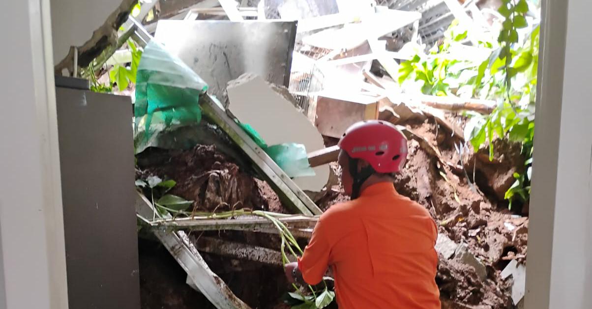 Akibat bencana tersebut, dinding bagian belakang rumah tampak jebol cukup lebar. Selain itu tumpukan tanah beserta puing tembok, serta tanaman yang ikut longsor menembus ke dalam ruangan.