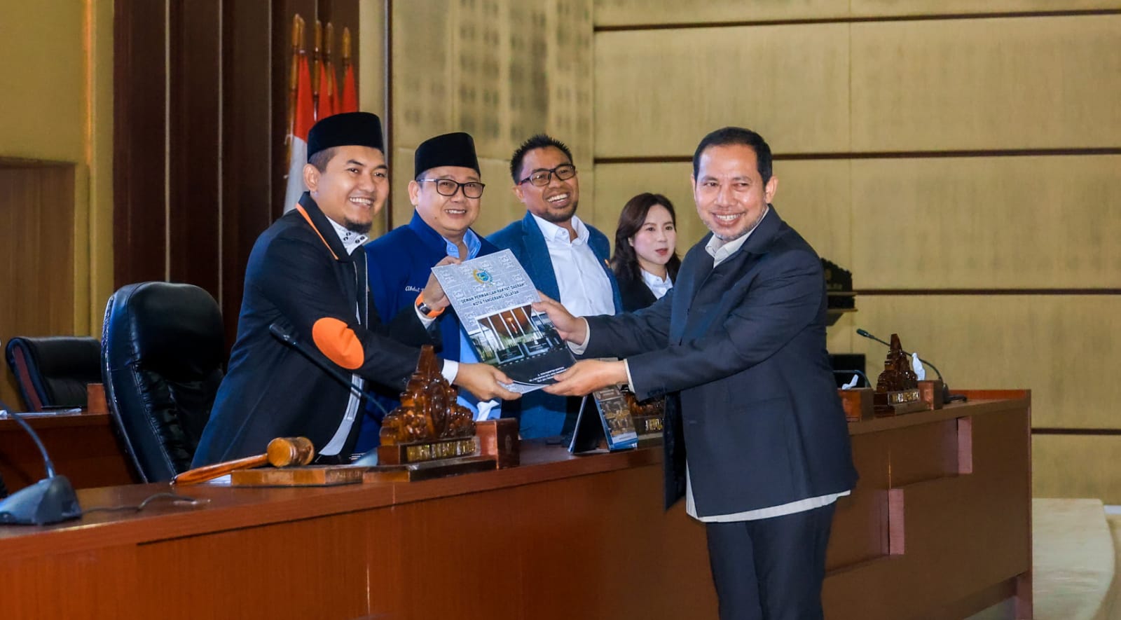 Anggota Fraksi PKS DPRD Kota Tangsel, Ali Rahmat, menyerahkan usulan Raperda Perubahan atas Perda Nomor 7 Tahun 2014 tentang Pendidikan Diniyah kepada Wakil Ketua DPRD M. Yusuf, disaksikan pimpinan DPRD lainnya dalam rapat paripurna.