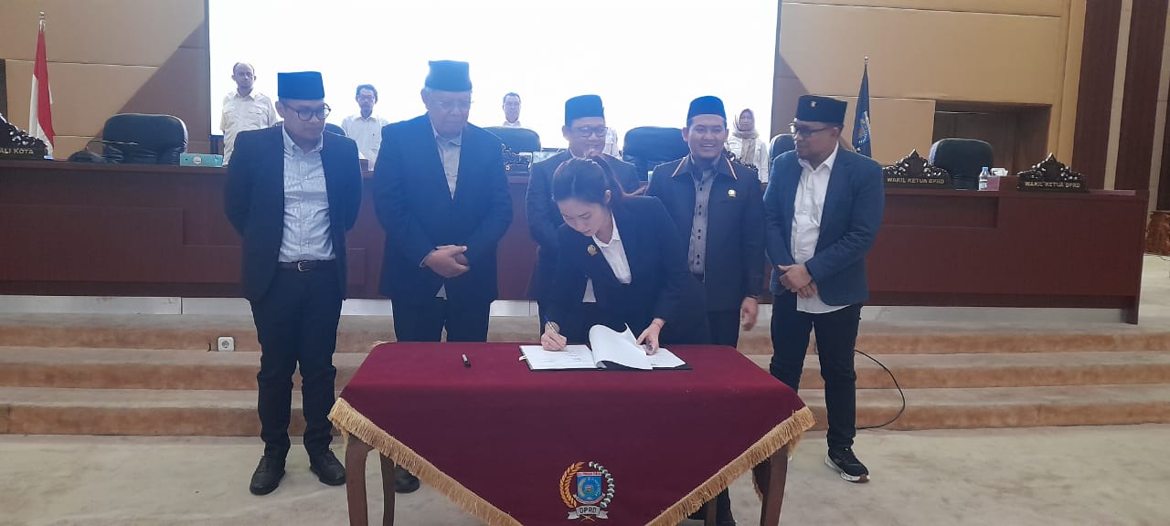 Caption : Wali Kota Benyamin Davnie bersama Wakilnya, Pilar Saga Ichsan bersama pimpinan DPRD Tangsel, saat persetujuan bersama Raperda Fasilitasi Penyelenggaraan Pesantren. Nampak Wakil Ketua DPRD Tangsel, Maria Teresa Suharja tengah menandatangani Raperda tersebut.